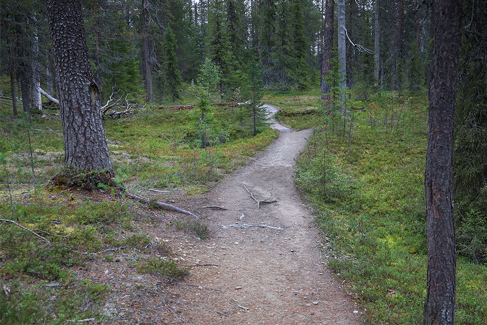 Polku mutkittelee hiekkakankaalla, jossa harjujen välissä on syviä suppia.